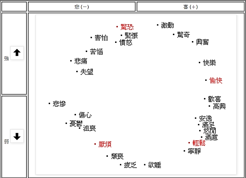 學者羅素(Russell,1980) 把各種情緒整理成下面的「情緒環狀模型」:越高位置的情緒越激揚,越低位置的情緒越不活潑。越左方的情緒越負面,越右方的情緒越正面。其中,「愉快、輕鬆、厭煩、驚恐」是這四個基本區域的典型代表情緒。