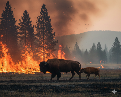一頭野牛帶小牛從火焰旁走過,這起火來自「森林野火」。(圖片由AI生成)
