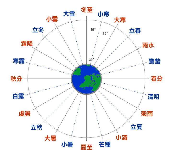 黃道一圈若像圓周一樣有360度,中國古代的天算家,就在黃道上每15度定一個節氣,於是定出一年共有24個節氣,這樣一來,春夏秋冬每一季都有6個節氣,如下圖。
