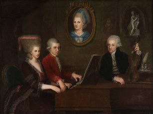 1780年左右時的莫札特全家畫像。中間是莫札特,右邊是父親,左邊是姊姊,畫框內的是已逝的母親。
