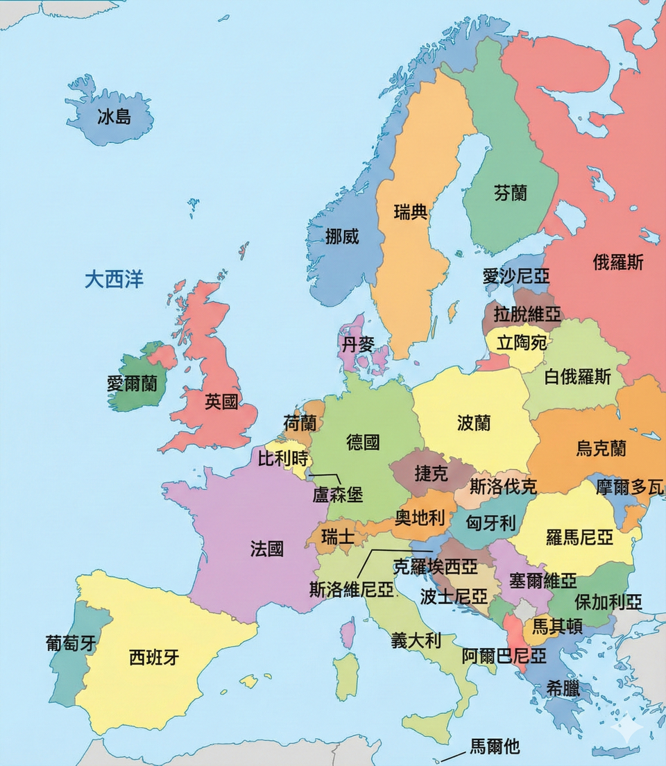 2. 看歐洲地圖,不在歐洲大陸的海島國家有哪四個?