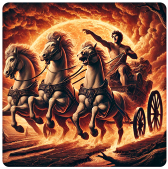 費伊登為了證明自己是太陽神之子,擁有父親的能力,於是請求駕駛父親的太陽馬車穿越天空。阿波羅見他意志堅定,只得答應,卻再三勸告他,駕馭太陽馬車並非易事。然而,費伊登無法抵擋內心的激動,他握住太陽馬車的韁繩,帶著無比的自信衝上了天際。