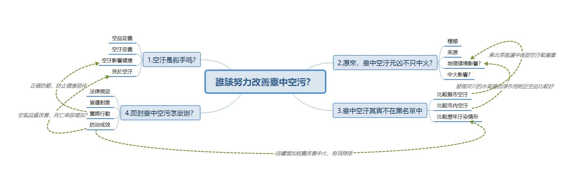 除了靠臺中市政府來改善臺中火力發電廠的廢氣排放外,工廠也應該要自主管理,生活在臺中市的我們更該減少造成空氣污染的活動。我們相信只要每個人都能為改善臺中空氣汙染而努力,清澈的藍天必定會再重現的!