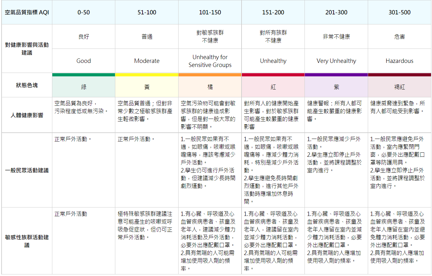 表3-1空氣品質指標AQI與健康影響及活動建議