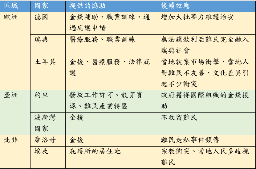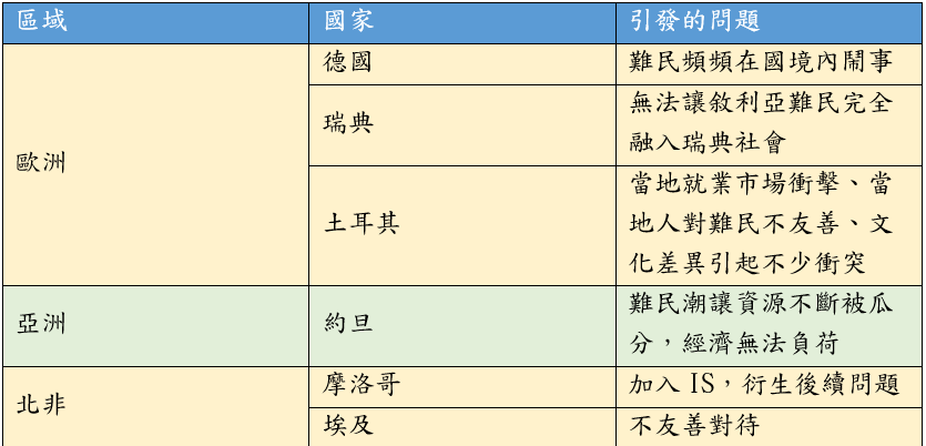 表二、難民在各國引發的問題