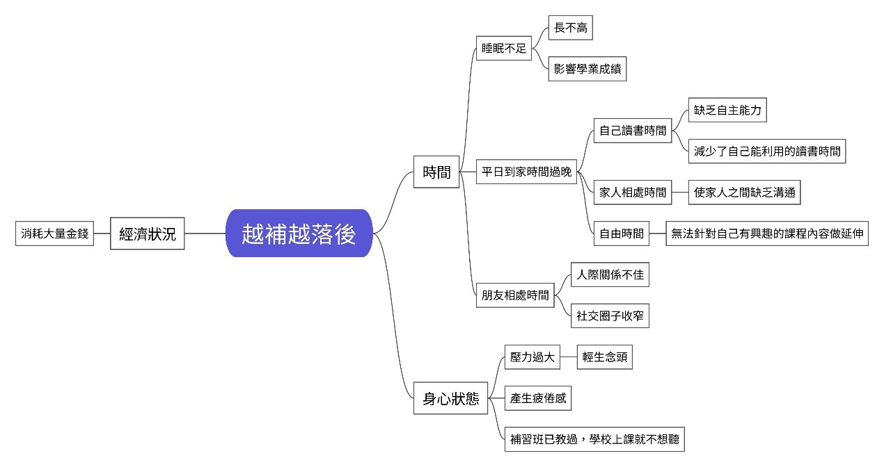 我們發現補習占據了很多的課後時間,造成平日學生很晚才到家,進而影響到了睡眠時間,花了很多時間在補習上也會導致和朋友疏離,也會影響跟家人相處的時間還有自己可以運用的讀書時間。長時間的學習和太多的補充資料都容易讓學生產生疲倦感。