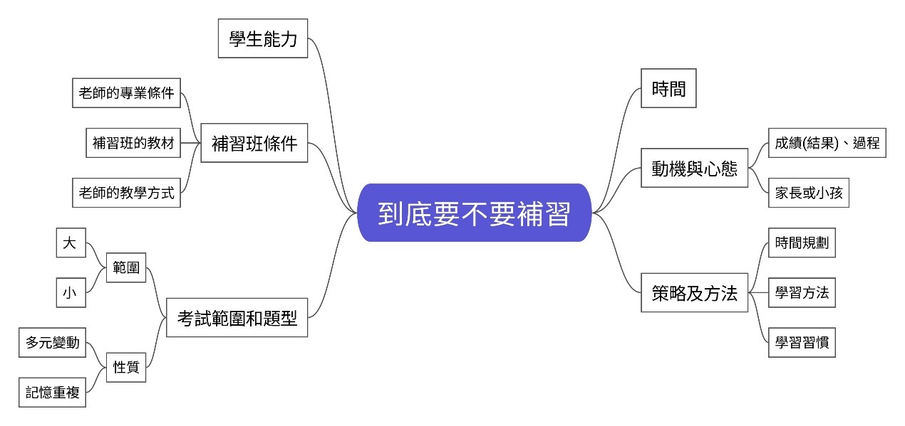 影響補習是不是有效的關鍵因素在於以下六點:學生本身的能力、考試的範圍和題型、動機和心態、補習班本身的條件、時間、學習的策略及方法。就學生能力而言,必須依據學生的能力給予適度的量,給過多的量,學生也無法吸收及負荷;考試的範圍小、題型在沒有變化的時候,補習可以發揮比較大的效果,當考試的範圍大、題型變化多的時候,補習不一定有效果;在孩子主動要求補習並且重視過程會比較有效果;補習班的師資比較專業或環境比較優良、教材較創新的,可能有比較好的效果,反之則不然。花太多的時間補習,沒有時間可以消化知識,有時反而會造成反效果。所以補習不一定能提升學習成效,有沒有良好的學習策略及方法,才是真正影響學習成效的關鍵。