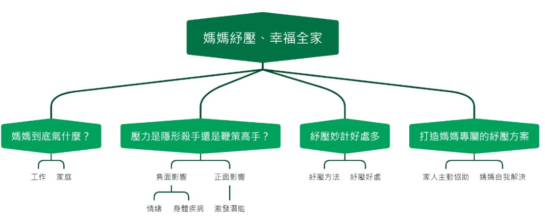 每個人都有不同的壓力,尤其是每天要處理很多事情的媽媽。我們看到媽媽一早起床就要準備早餐、載我們上學、接我們放學、準備晚餐。接著,再指導我們家課、催促我們去洗澡、刷牙和睡覺。我們覺得媽媽壓力很大,因為每天都有很多事情要處裡,除了忙我們的事之外,她還要處理工作的事情。事情做不完或不順利的時候,常常對我們發脾氣,莫名其妙罵我們,感覺媽媽心情很煩躁。我們這一組經過討論後,想要知道怎麼紓解媽媽的壓力,讓媽媽更輕鬆一點,我們才不會一直挨罵。