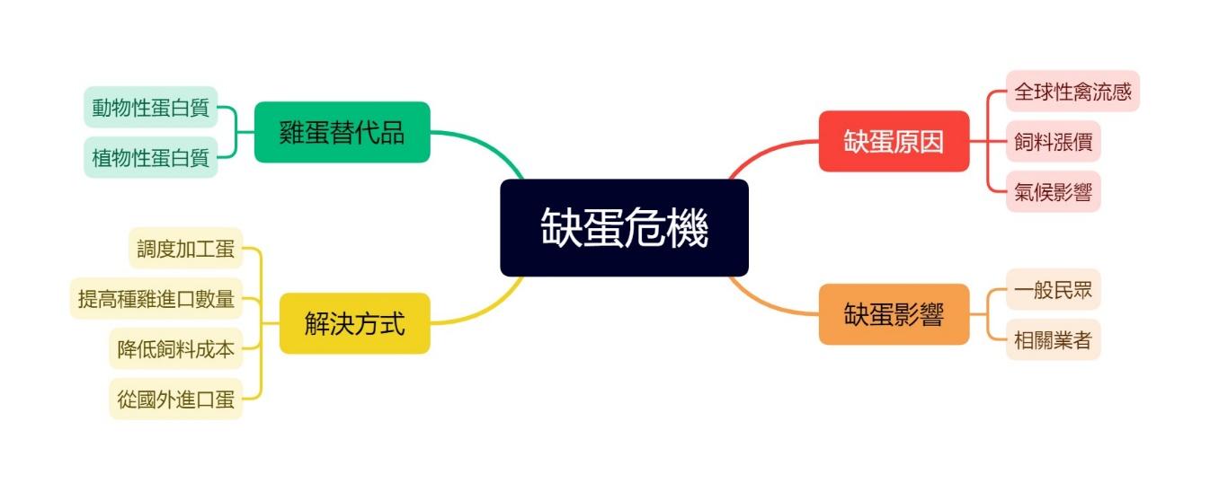 針對台灣這次的蛋荒,我們首先想知道是什麼原因造成缺蛋的情況?缺蛋對社會產生了哪些影響?彙整相關資料後再去分析該如何解決缺蛋問題以避免缺蛋的狀況再度發生,研究最後再整理出在缺蛋時期可以替代雞蛋營養的食品供大眾參考。