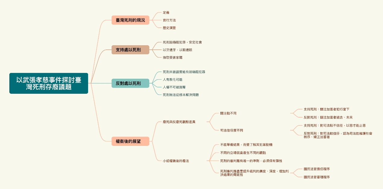 我們想了解武張孝慈事件各方人士觀點前必須要先知道臺灣死刑的現況,包含死刑的定義、判決程序、實施方法等。接著我們需要了解武張孝慈事件的始末並認識武張孝慈的個人生平,再蒐集此事件各方人士的說法並加以分析,研究最後我們希望能藉由武張孝慈事件以小見大,思考臺灣爭論不休的死刑存廢議題,能否有最好的解方。