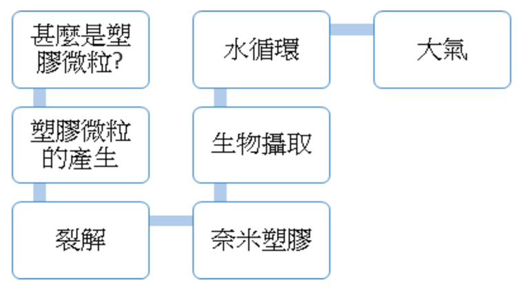 塑膠微粒,會經由三個管道進入人體,包含:1.生物攝取:經水中生物攝取,進行生物累積和生物放大作用;2.水循環:在水中的塑膠微粒經蒸發後進入大氣,並降水,重複此循環;3.有些在水中的塑膠微粒,經蒸發進入空氣中,而人類呼吸空氣時可能攝入。