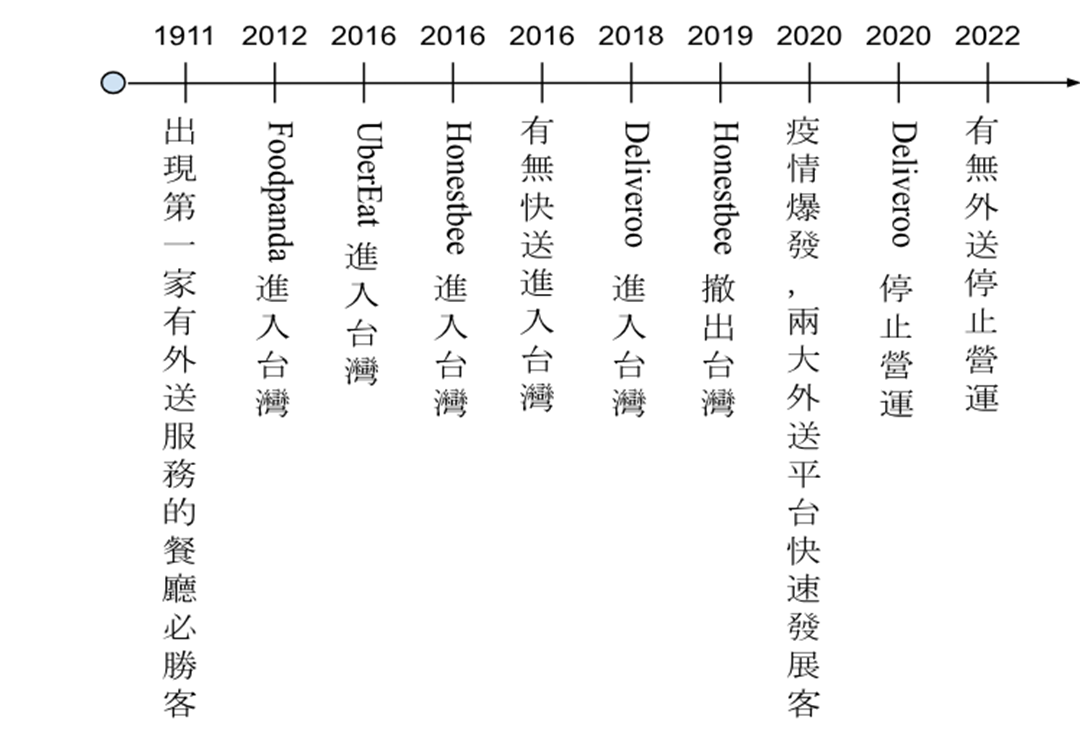 台灣外送平台服務的是指顧客在線上平台或軟體上訂購商品(此研究特指外送食物),再讓專員代為取貨並送達顧客指定地點的一個服務業。由表3-1可知:1991年,台灣出現第一家擁有外送服務的餐廳——必勝客。隨後於2012至2018年間,Foodpanda、UberEat、Honestbee、有無快送、Deliveroo陸續進入台灣,目前後三者皆已停止營運。2020年,疫情爆發,兩大外送平台(Foodpanda、UberEat)快速發展。