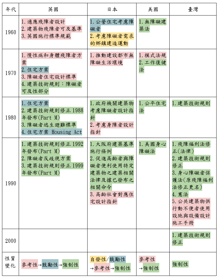 在臺灣,輪椅使用者面臨著嚴重的路權挑戰。雖然公共空間如騎樓和人行道是為行人設計的,但輪椅使用者經常因為這些區域被雜物或違規停車佔用,迫使他們走在車道上,增加了風險。此外,當他們因改道而發生交通糾紛時,往往處於不利地位,這讓他們感到極大的不公平,並希望能夠通過法律改變來改善現狀。因此我們參考中華民國內政部建築研究所的《我國與英、美、日無障礙建築環境法令之比較研究》,並將其內容中各國相關法規與分類整理成表2。