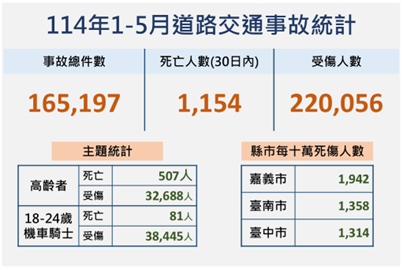 近年來,車禍頻繁發生,光是114年1到5月,全臺就發生超過16.5萬件交通事故,受傷人數更高達22萬人(如圖1-1)。這樣的統計數據使我們了解:駕駛人對於一個既安全又聰明的行車助手的需求越來越迫切。