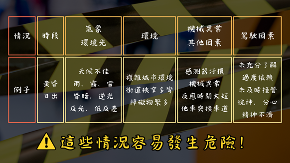 判斷失常而發生危險的情況大多與天候、路況不佳相關,以下(圖3-2)是我們歸納整理容易發生危險情況的例子: