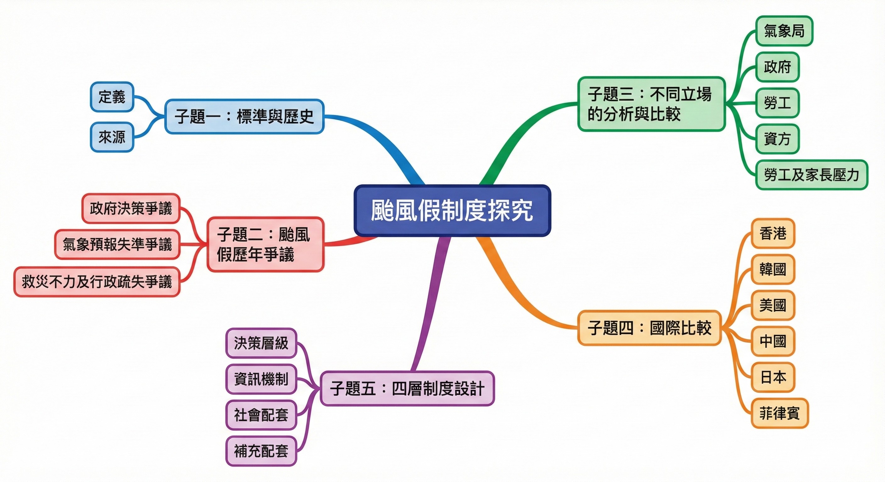 為了全面理解颱風假制度,我們先從標準與歷史入手,釐清颱風假的法規沿革與決策流程,了解制度是如何形成的。接著,我們回顧歷年重大爭議事件,分析不同颱風造成的決策失誤與民怨,試著找出問題的關鍵。之後,我們再蒐集勞工、政府、企業、氣象單位與教育界的意見,從多方立場比較彼此關注的焦點與挑戰,理解颱風假牽涉的多重立場不同的衝突。最後,為了找出改進方向,我們參考日本、香港、菲律賓……等國家的做法,比較國際經驗中有哪些值得借鏡之處,形成我們對未來制度優化的建議。