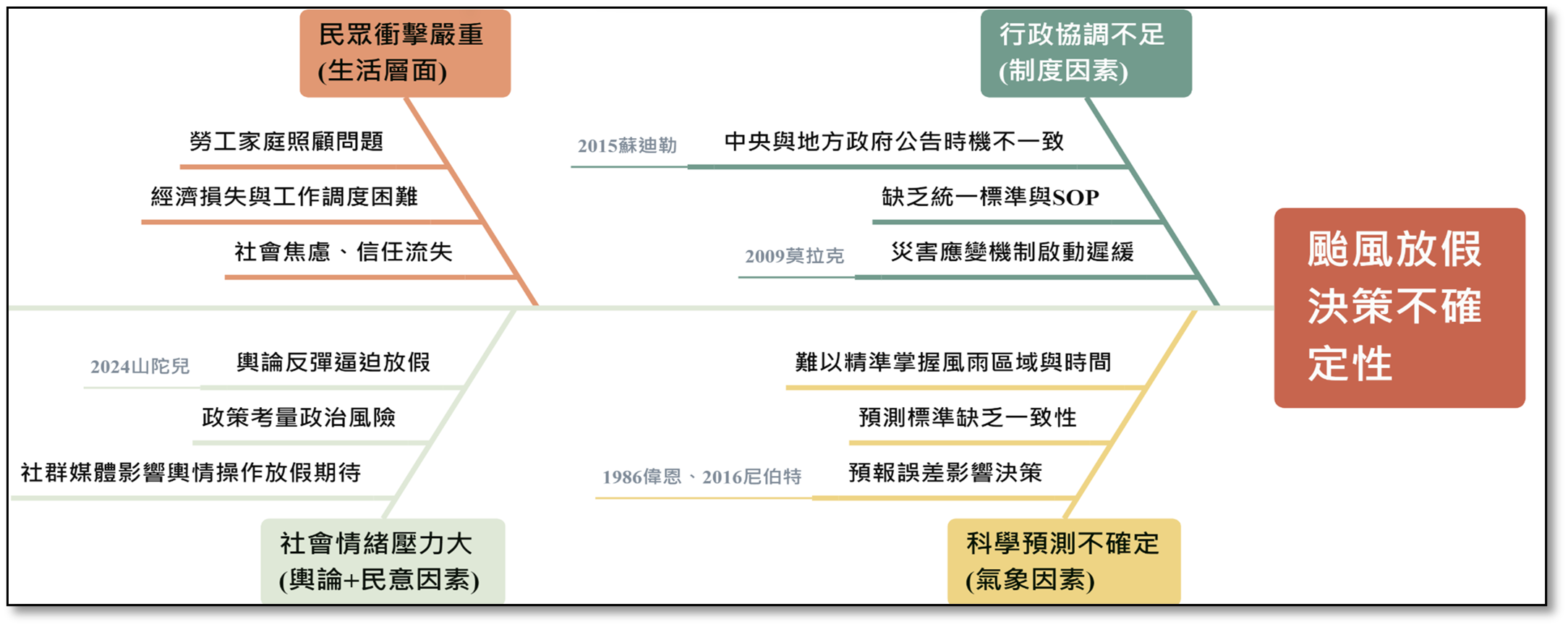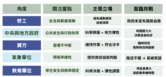 颱風假涉及多方利害關係人,不同群體有不同的期待與焦慮。從表二可見勞工最關心的是通勤安全與薪資能否受到保障;政府必須兼顧公共安全與行政效率,同時承受輿論壓力;企業希望減少停工造成的營運損失並維持物流與排班穩定;氣象單位則努力提供更精確的預報,卻受限於颱風路徑和強度的科學不確定性;教育單位則必須兼顧師生安全與課程進度,避免學習中斷。