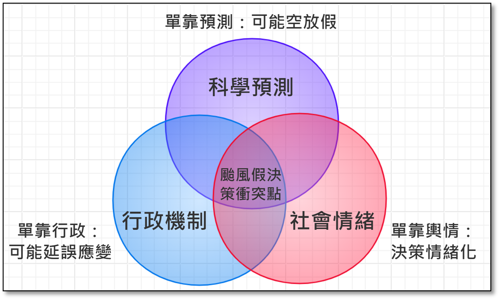 臺灣的颱風假制度在2000年頒布《天然災害停止上班及上課作業辦法》後,才真正有了明確的法律依據,從早期的臨時宣布逐漸走向科學化。然而就如(圖一)中所示,中央與地方政府在權責分工上仍然存在模糊地帶,導致不同地區的公告時間和標準不一致。中央統一指揮雖能兼顧全國性協調與整體管理,但容易忽略地方的地理特性與即時災情;地方政府則能因地制宜、迅速做出反應,但各地標準不同,使得民眾常感到混亂,甚至懷疑政府的判斷依據。