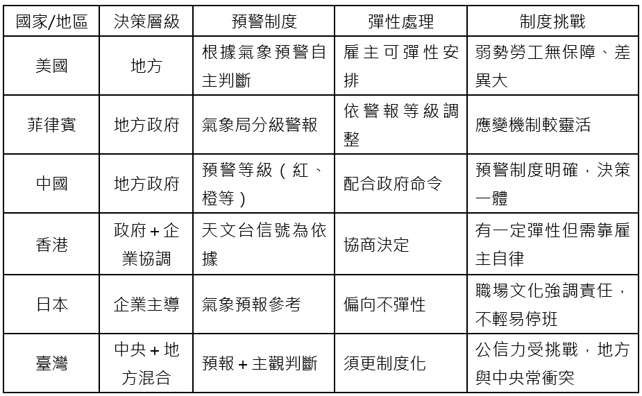 根據我們蒐集的資料,綜觀各國做法,可以看出颱風假決策普遍走向科學化與透明化,但各國在制度設計上仍呈現不同特色。日本採取企業文化主導的方式,由公司自行決定是否停班停課,因此勞工必須在強風豪雨中通勤的風險相對較高。南韓雖然會依據氣象局預警調整,但企業與地方政府的標準並不完全一致,停班停課的分類雖然清楚,但實際落實上仍有差異。香港則有明確的風球警報制度,並搭配勞工處提供的《工作守則》,讓勞資雙方都能依照相同標準行動。中國大陸的做法則是由地方政府依災情及風災分級預警制度決定停課停班與防災措施,並在重大颱風來襲時啟動封港停工、交通管制等應變。菲律賓以氣象局的警報等級作為判斷依據,當發出二號風訊(Signal No.2)以上警報時就會自動停課,並給予地方政府彈性調整停班。美國則是由州政府、市政府或學區各自決定是否停課停班,屬於地方分權模式,雖然資訊較為分散,但更符合各地實際狀況。