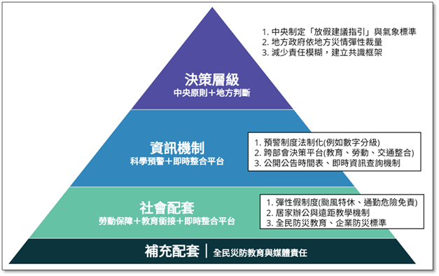 在整理臺灣現行制度問題與國際案例後,我們提出「四層制度設計」(圖三),用以提升颱風假決策的科學化、透明度與公信力。