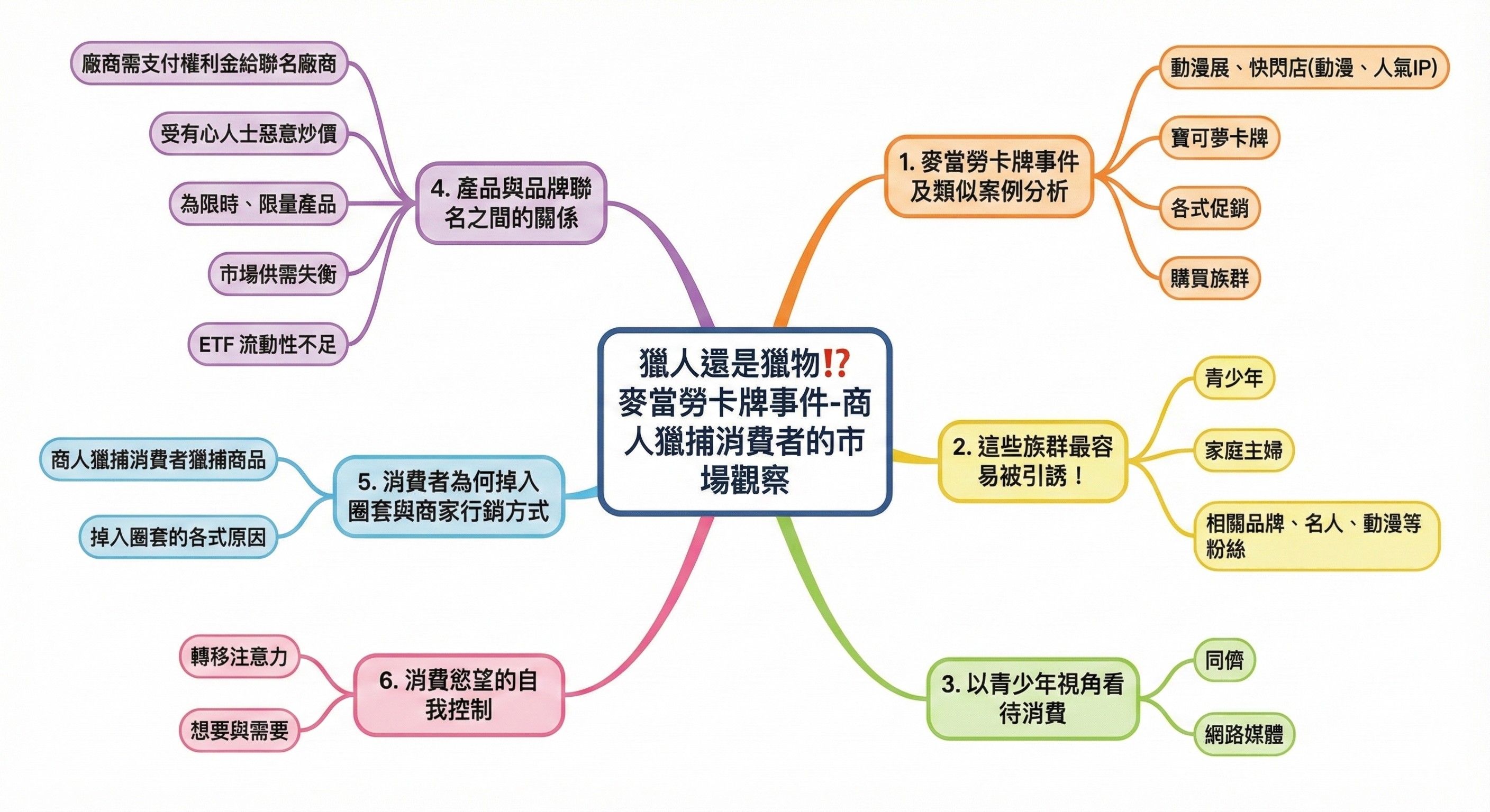 最後,如同麥當勞卡牌案例的聯名行銷手段也越來越普遍,商家會與明星或知名品牌合作,這樣不僅能吸引特定粉絲的注意,還能透過粉絲對聯名對象或品牌的喜好來推動購買,但這類消費者購買商品經常是出於對聯名對象或作品的情感連結,而非真正看中產品本身。