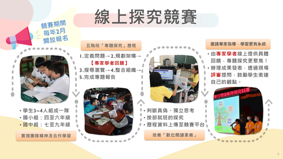 本計畫提供一個有鷹架的線上數位閱讀平台,以專題探究為軸,小組自學為輔,鼓勵全國師生參與,共同達成12年國教自主學習的目標。